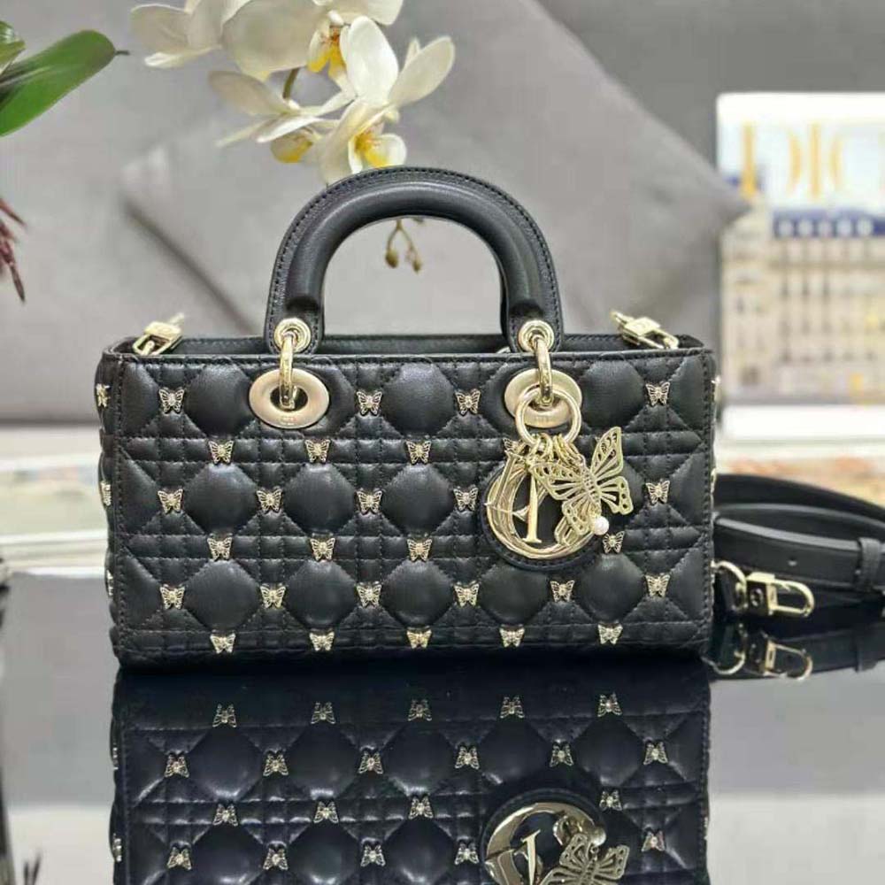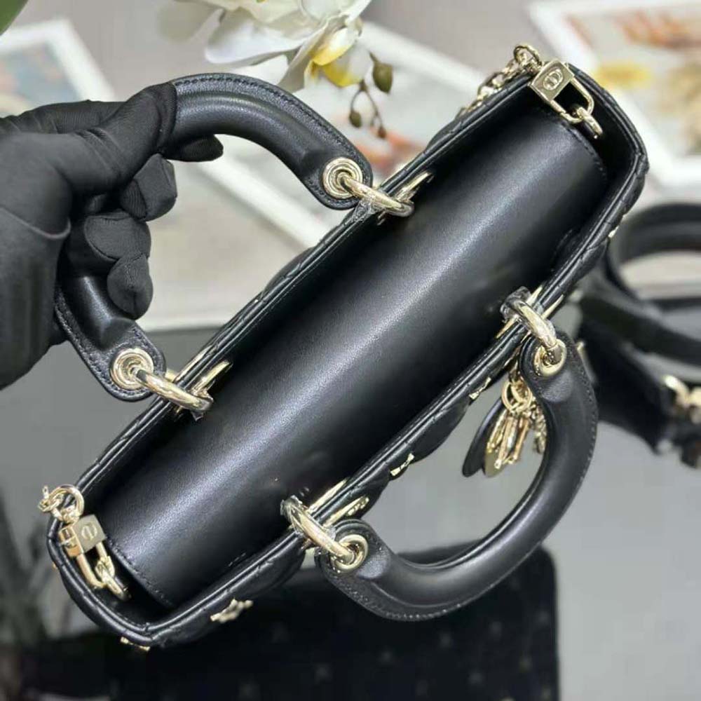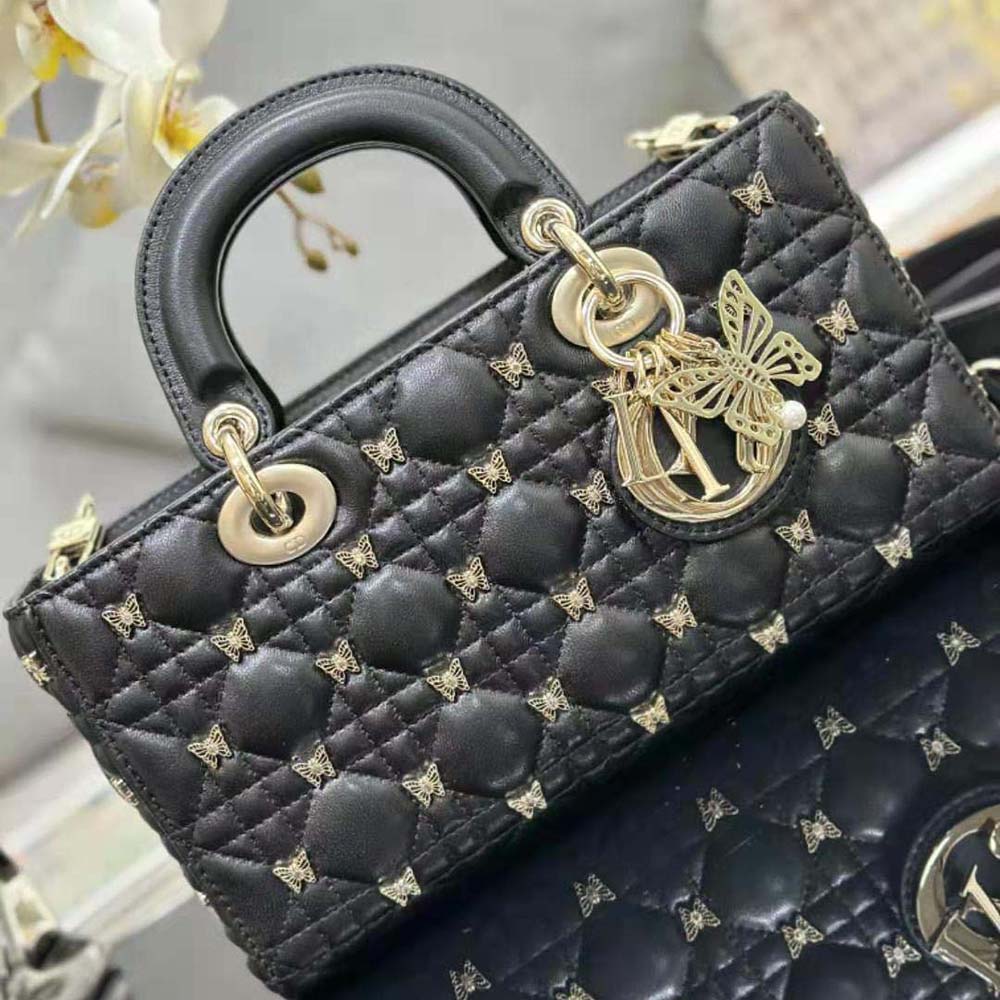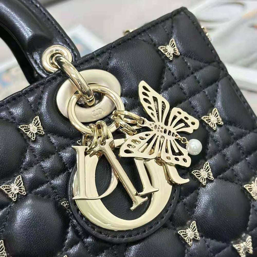 Dior Women Medium Lady D-joy Bag Black Cannage Lambskin with Gold-Finish Butterfly Studs