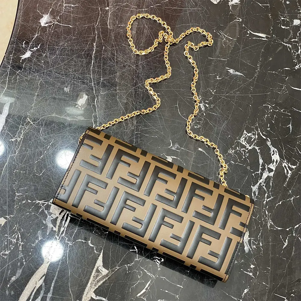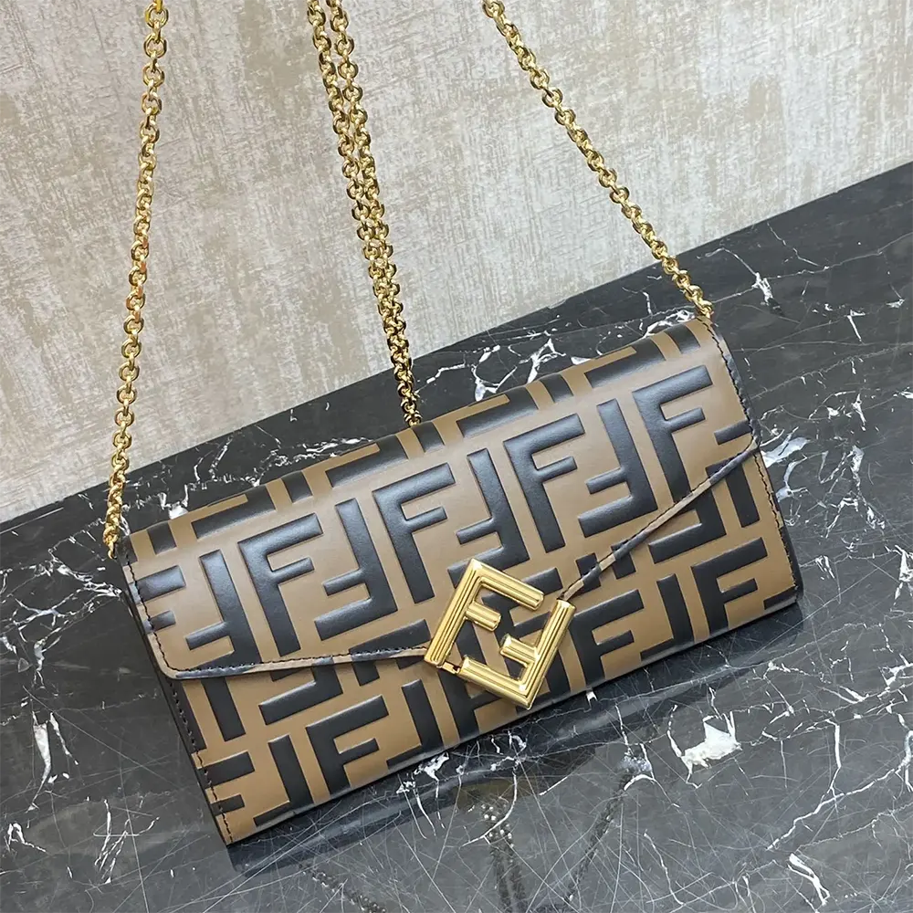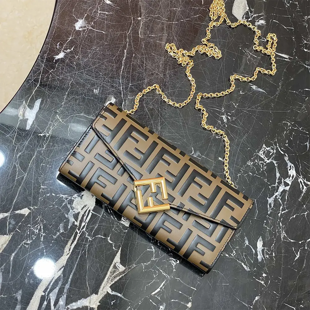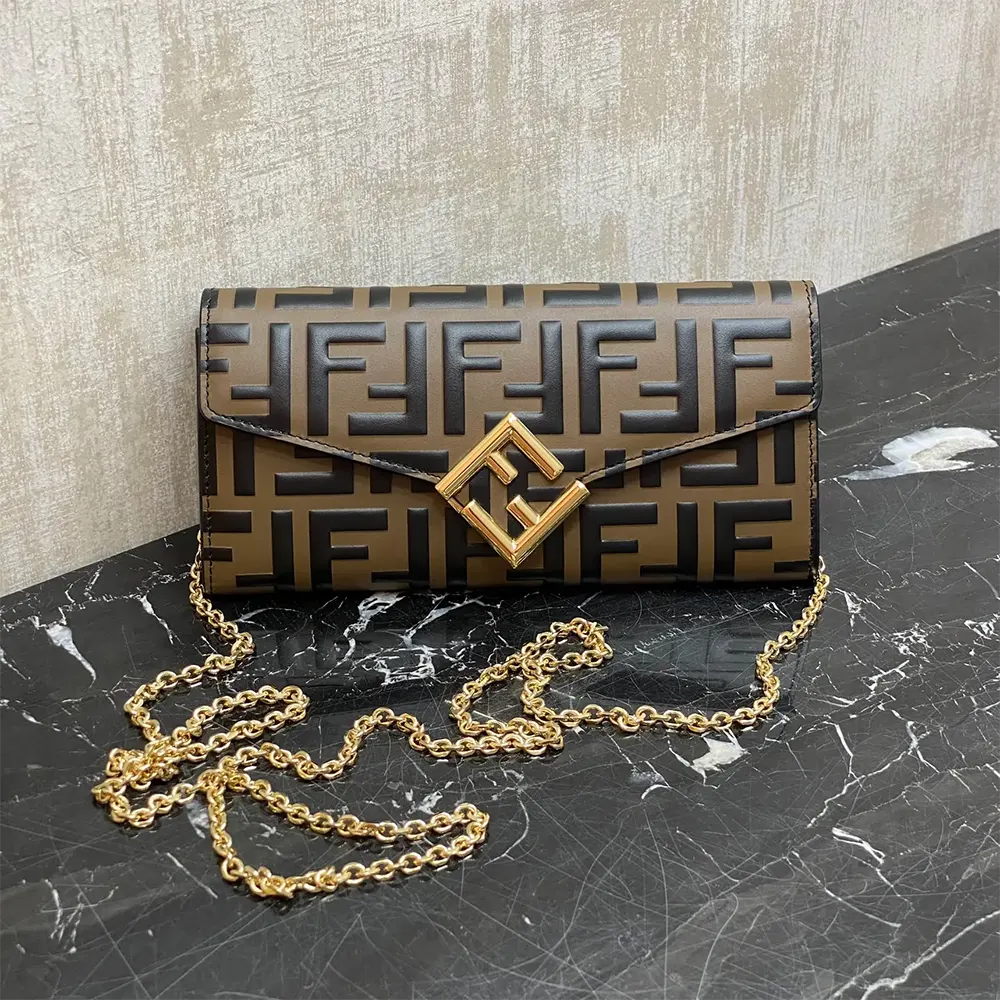Fendi Women FF Diamonds Continental With Chain Brown and Black FF Leather Wallet