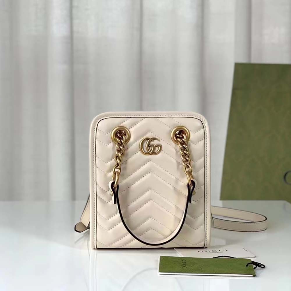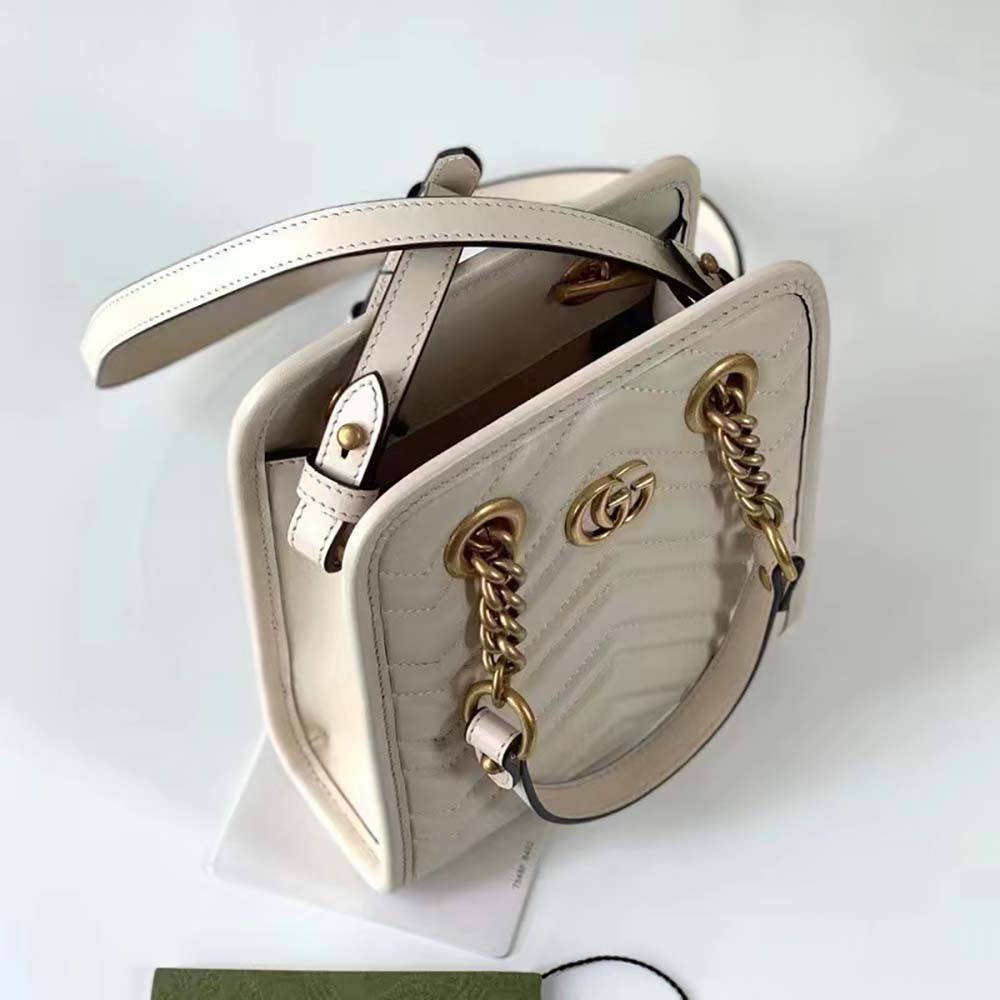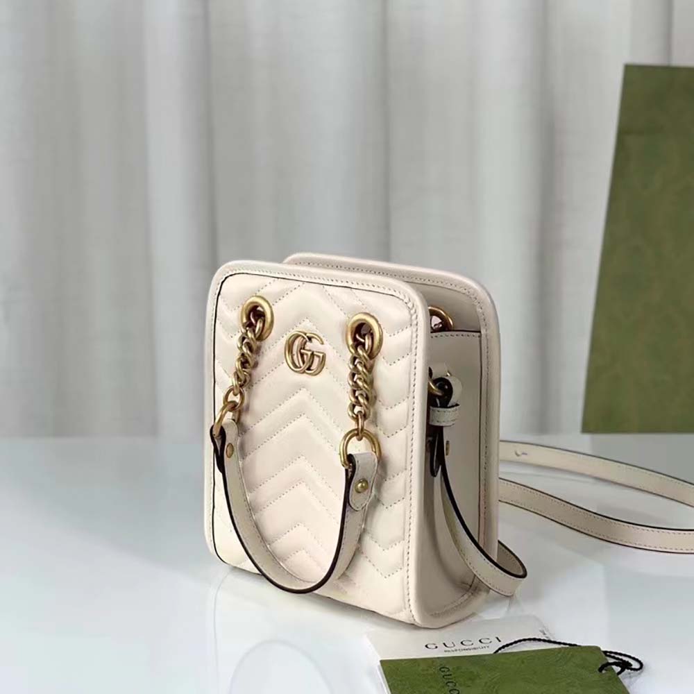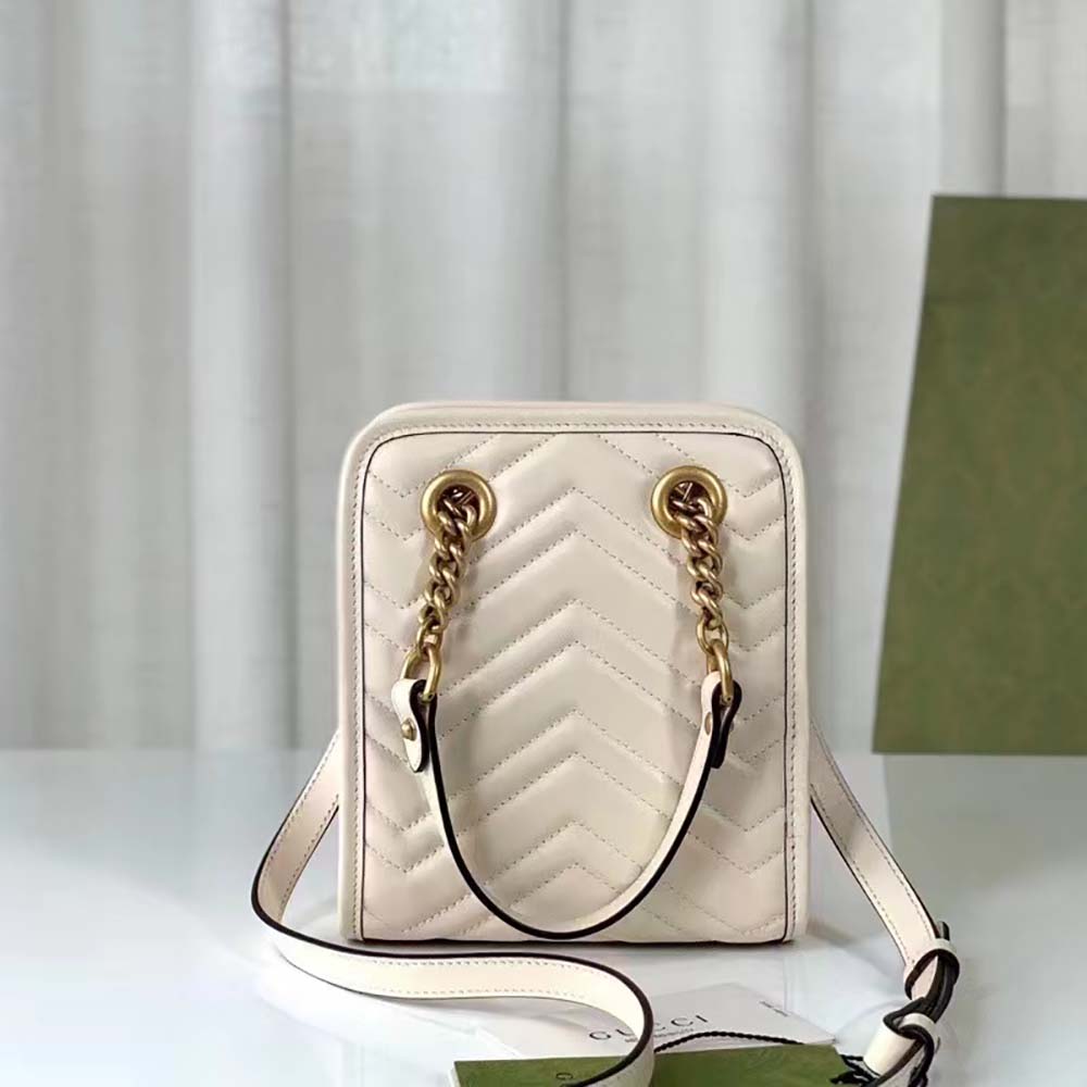 Gucci Women GG Marmont Matelassé Mini Bag White Chevron Leather Double G 696123