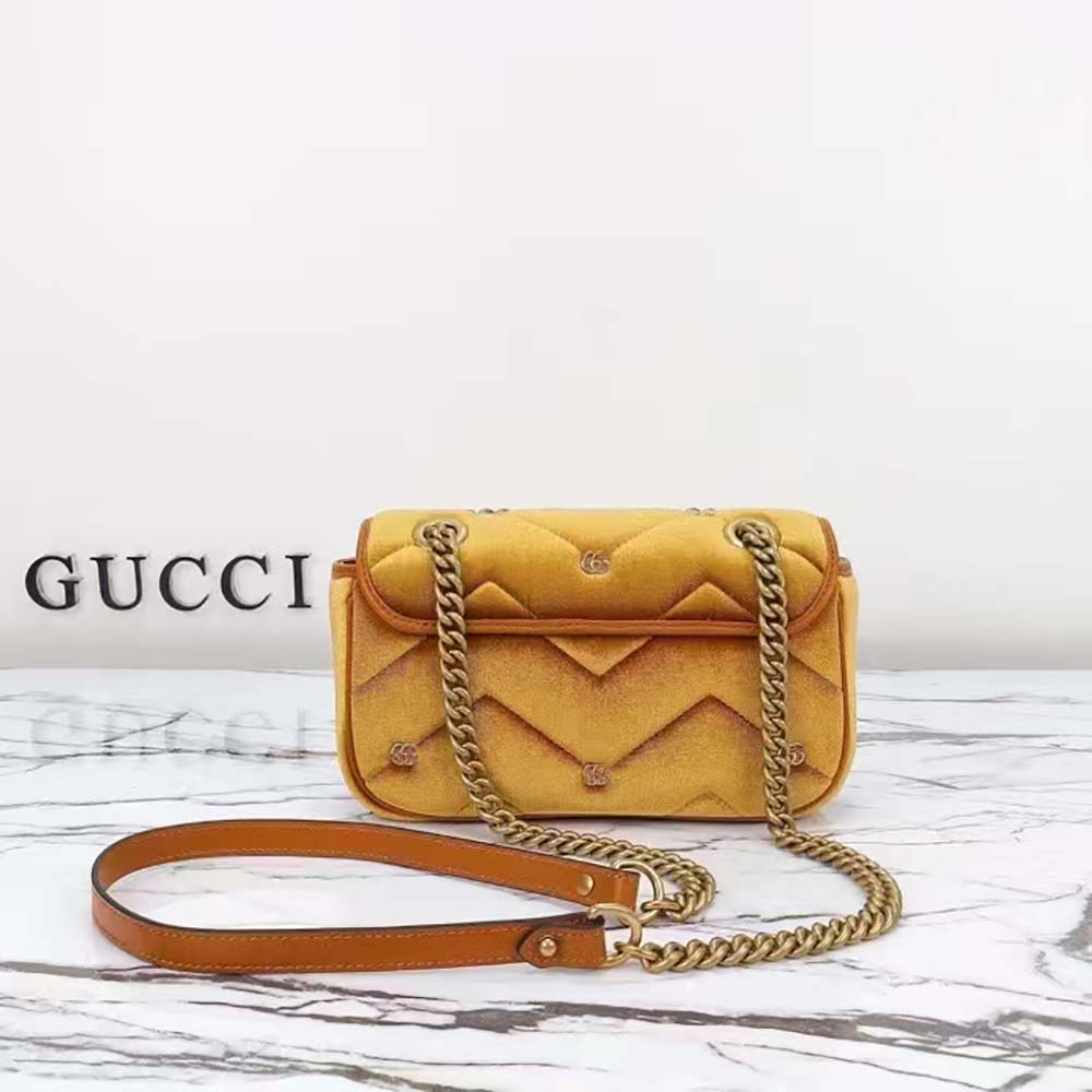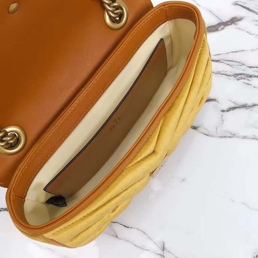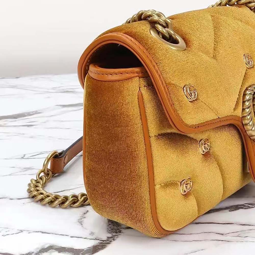 Gucci Women GG Marmont Mini Shoulder Bag Dark Yellow Quilted Chevron Velvet Leather Double G 446744