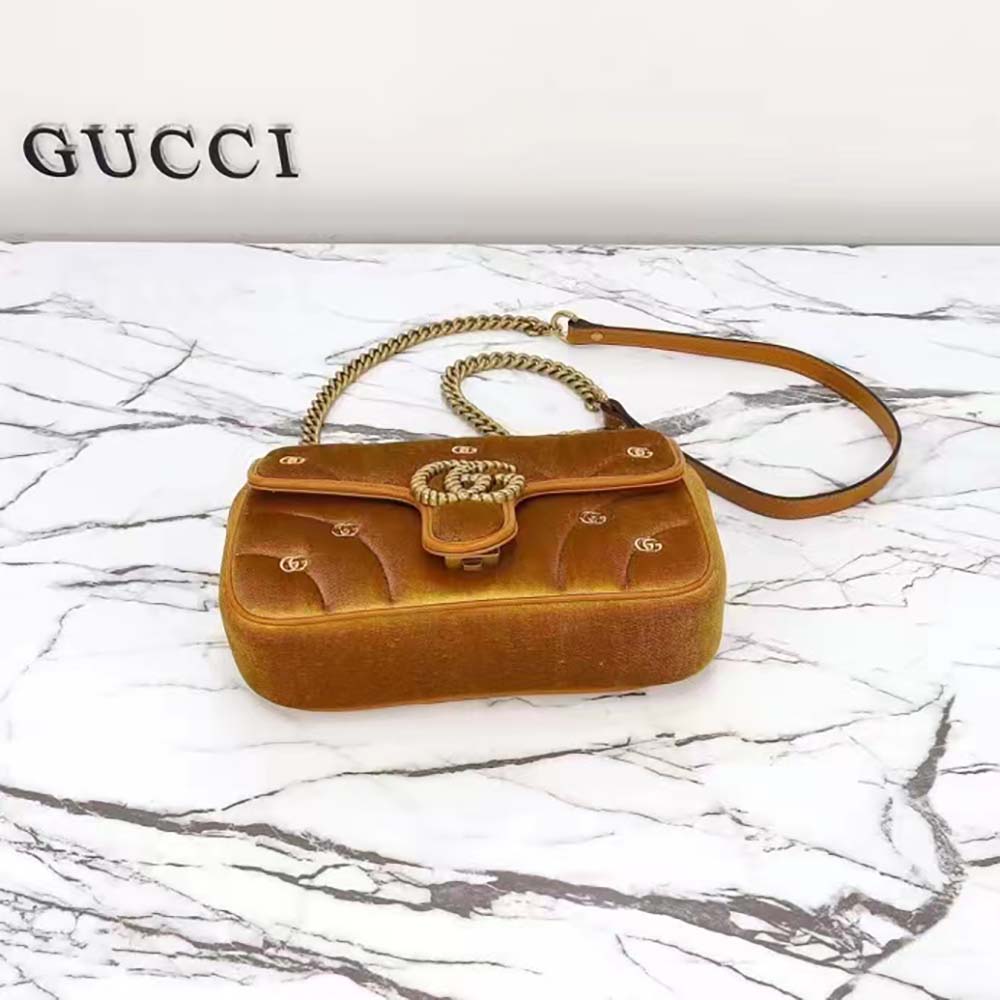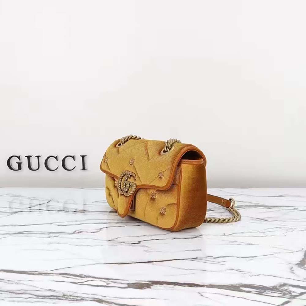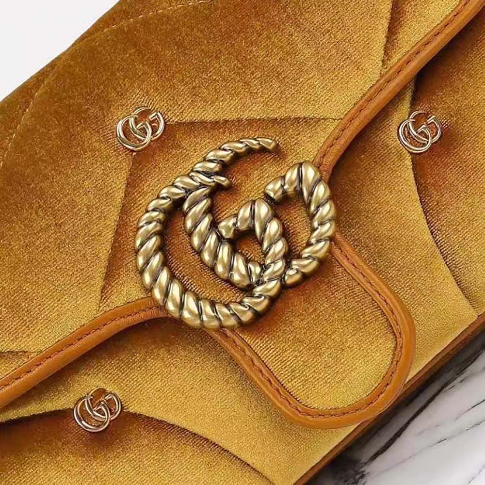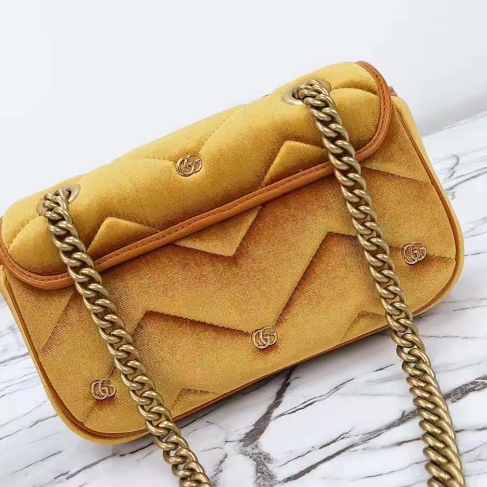 Gucci Women GG Marmont Mini Shoulder Bag Dark Yellow Quilted Chevron Velvet Leather Double G 446744