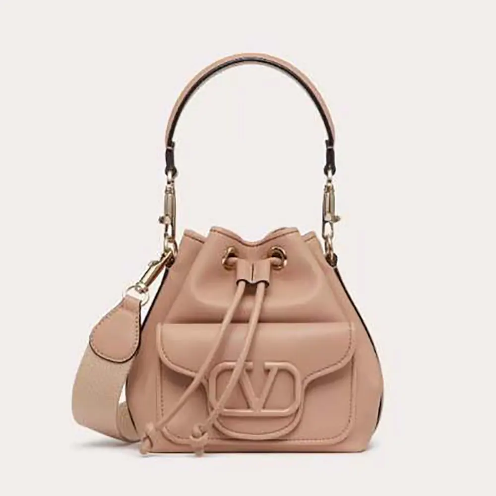 - Valentino Garavani Locò bucket bag in calfskin leather with enamel tone-on-tone VLogo Signature detail.