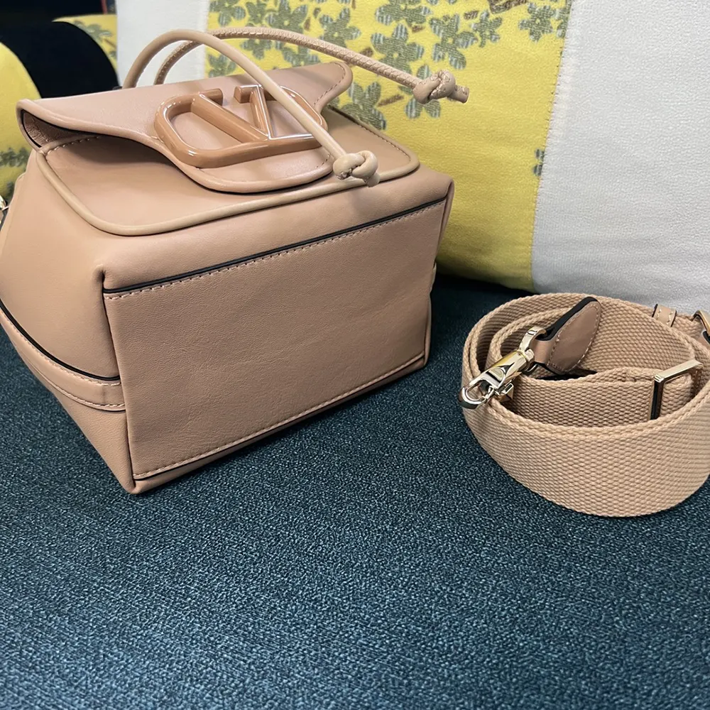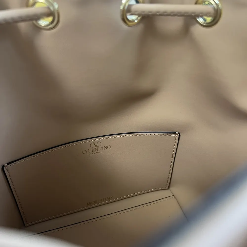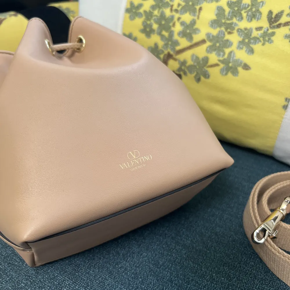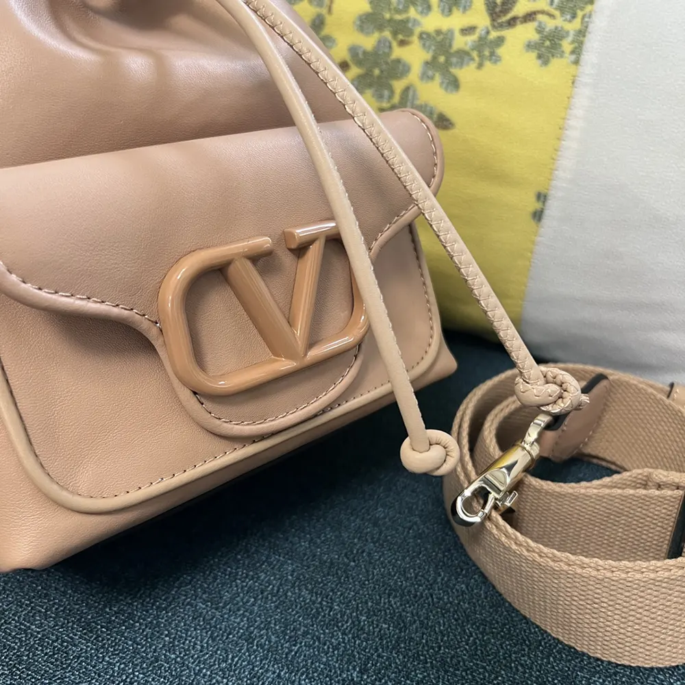 - Valentino Garavani Locò bucket bag in calfskin leather with enamel tone-on-tone VLogo Signature detail.